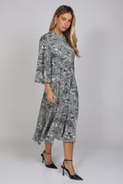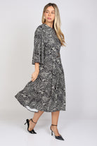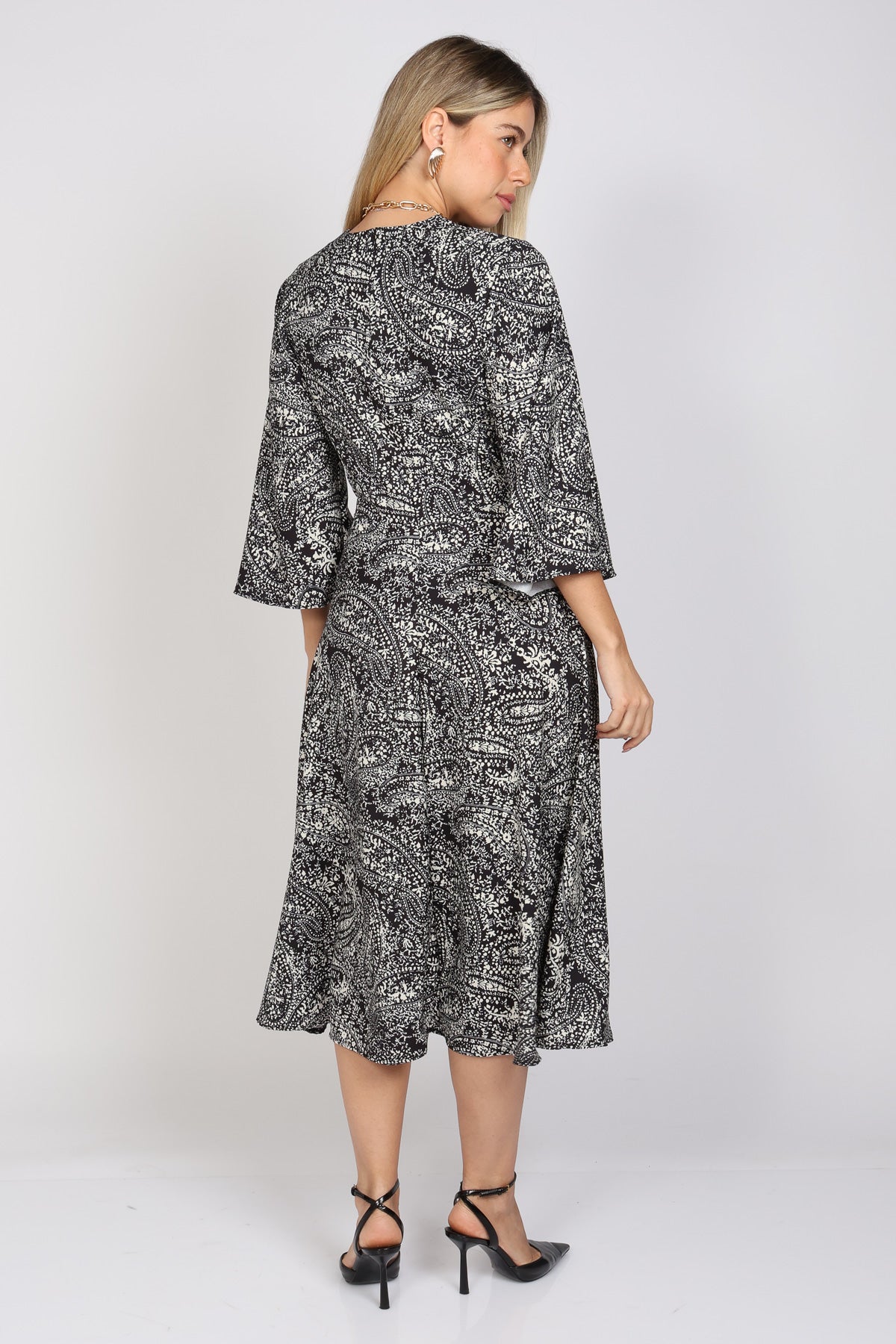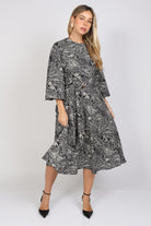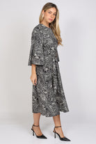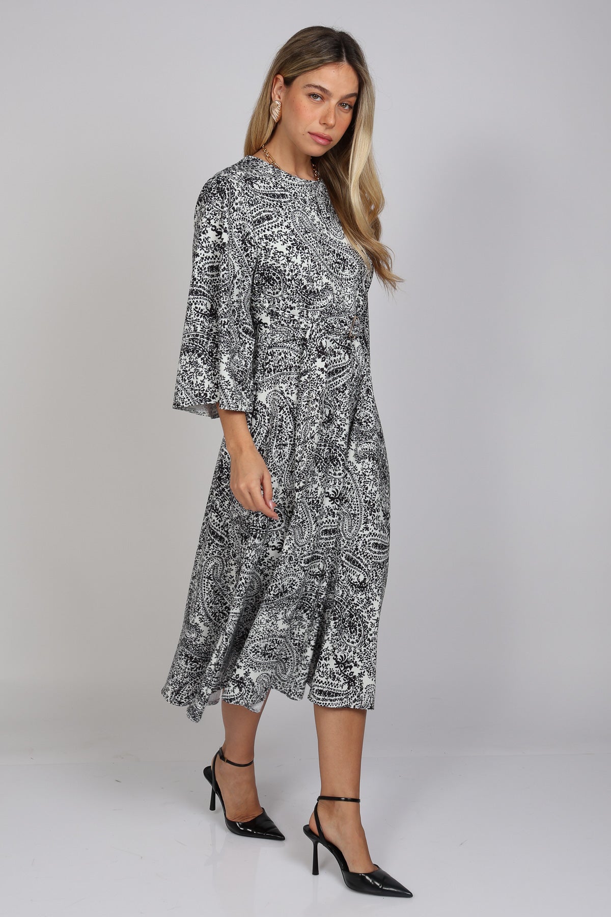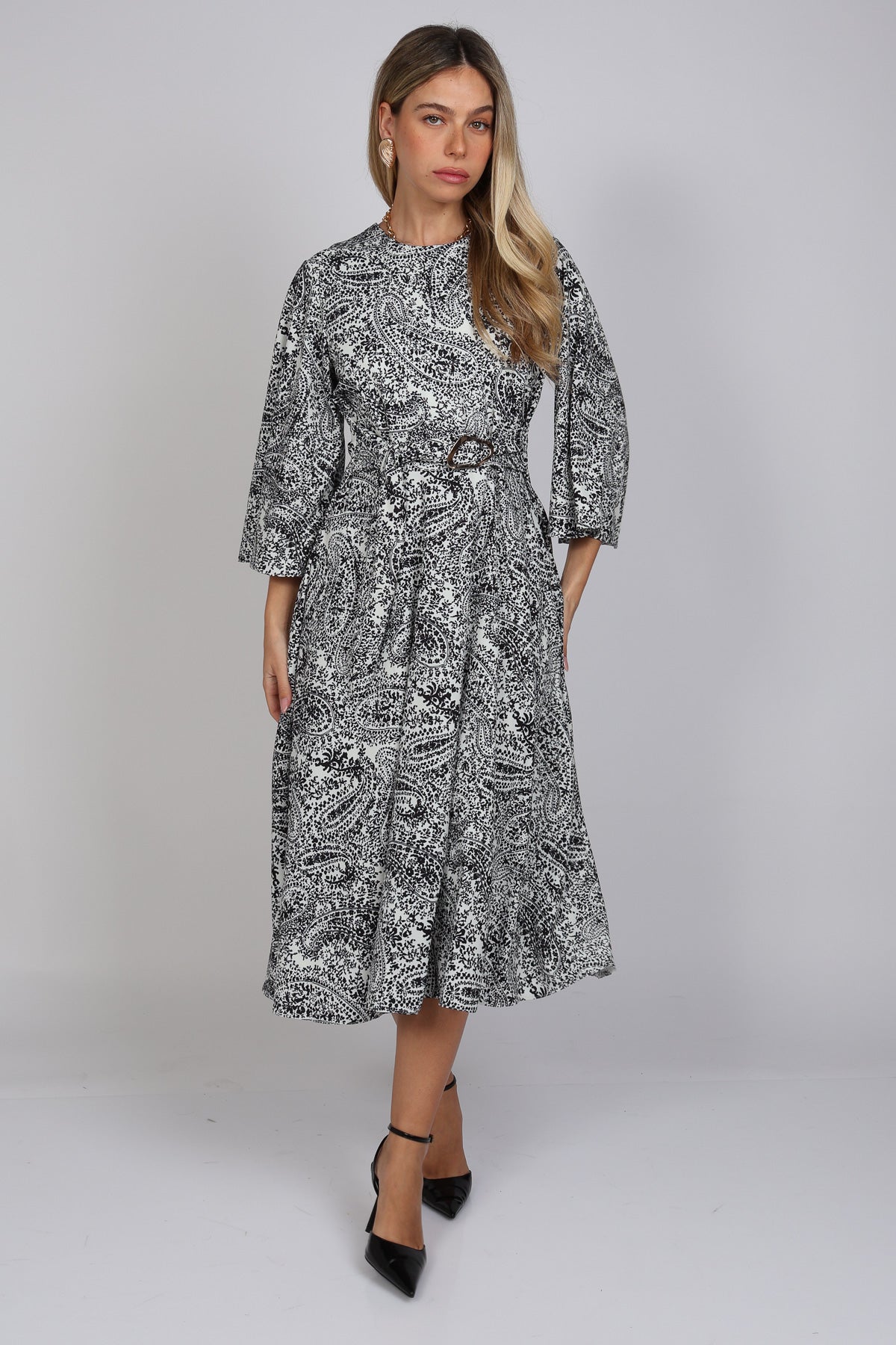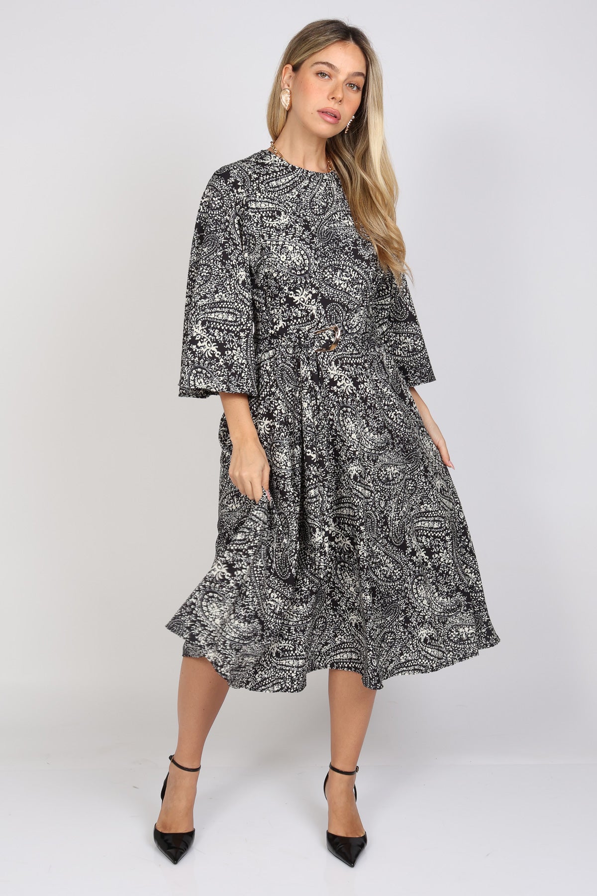שמלה שמשלבת דפוס אתני על-זמני עם גזרה נשפכת שמעניקה תנועה רכה ומחמיאה. החגורה עם האבזם מוסיפה מגע של מבנה ומדגישה את המותן, בעוד השרוולים הנשפכים יוצרים תחושת קלילות ואלגנטיות. בד איכותי שמרגיש נהדר על הגוף, מעניק מראה עדכני ויוקרתי.