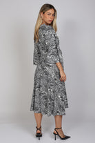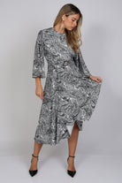 השילוב בין הדפוס העשיר, הגזרה הנשפכת והאבזם המעוצב יוצר שמלה שמרשימה מבלי להכריח - פריט שמקפיץ כל הופעה לערב מלא סטייל וביטחון.